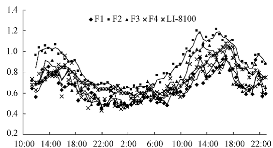 圖b  RR-7330測量系統(tǒng)四個(gè)通道測量的土壤呼吸與li-8100測量日變化對比(中國林科院,高峻,2011)
