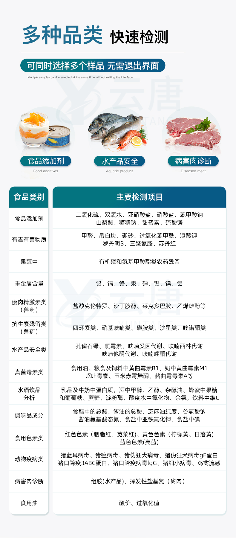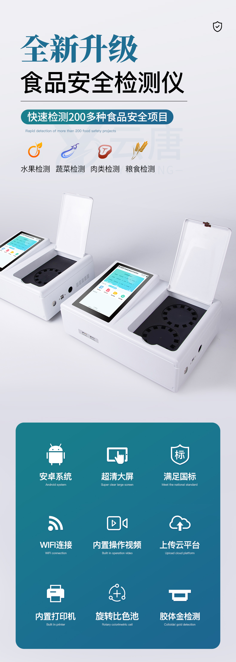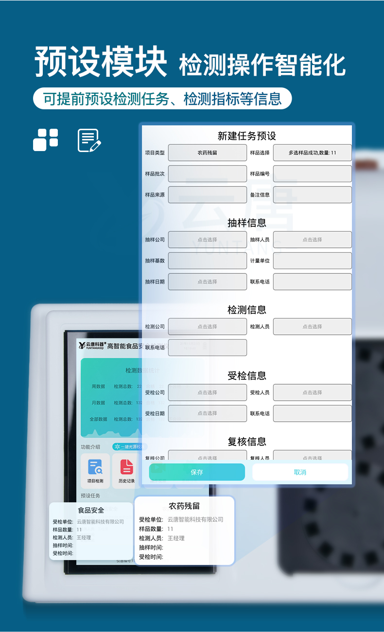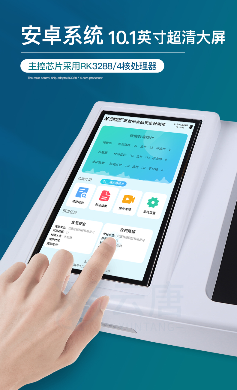 山東云唐智能科技有限公司生產(chǎn)的高智能食品安全檢測儀為集成化食品安全快速檢測分析設(shè)備,采用臺式一體化設(shè)計(jì),可快速檢測200多種食品安全項(xiàng)目,包含非食用化學(xué)物質(zhì)、濫用食品添加劑、農(nóng)藥殘留、獸藥殘留、重金屬、病害肉、營養(yǎng)強(qiáng)化劑、抗生素類殘留、激素類殘留、真菌毒素類殘留、化學(xué)類殘留等項(xiàng)目的定性定量檢測。