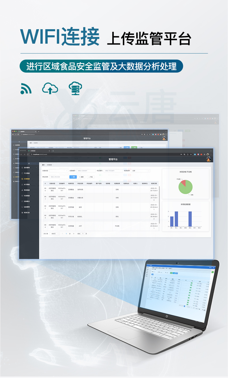 ★數(shù)據(jù)監(jiān)管系統(tǒng):同步對接監(jiān)管平臺,數(shù)據(jù)可局域網(wǎng)和互聯(lián)網(wǎng)數(shù)據(jù)上傳,檢測結(jié)果可選擇直接傳至食品安全監(jiān)管平臺。進(jìn)行區(qū)域食品安全監(jiān)管及大數(shù)據(jù)分析處理與數(shù)據(jù)統(tǒng)計(jì),檢測區(qū)域食品安全長短期動態(tài),達(dá)到食品安全問題預(yù)估、預(yù)警。(需提供對應(yīng)食品理化分析系統(tǒng)計(jì)算機(jī)軟件著作權(quán))。