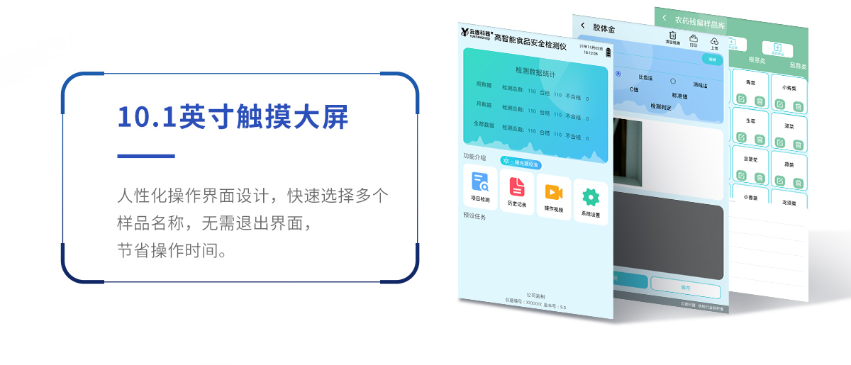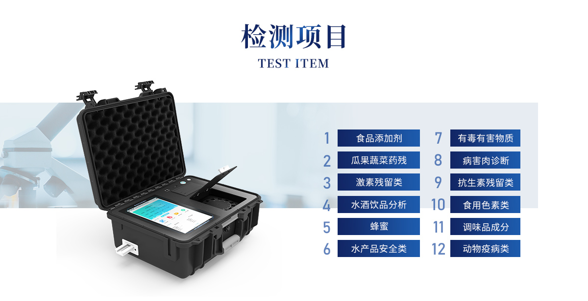 山東云唐智能科技有限公司生產(chǎn)的高智能食品安全檢測(cè)儀可快速檢測(cè)200多種食品安全項(xiàng)目,包含非食用化學(xué)物質(zhì)、濫用食品添加劑、農(nóng)藥殘留、獸藥殘留、重金屬、病害肉、營(yíng)養(yǎng)強(qiáng)化劑、抗生素類(lèi)殘留、激素類(lèi)殘留、真菌毒素類(lèi)殘留、化學(xué)類(lèi)殘留等項(xiàng)目的定性定量檢測(cè)。